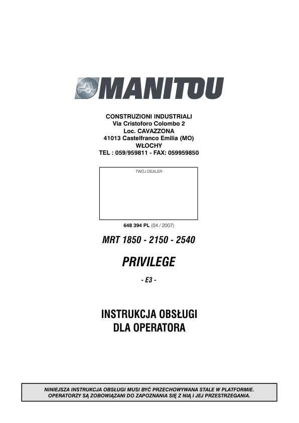 Manitou 1850 2150 2540 Telehandler Operators Manual PL