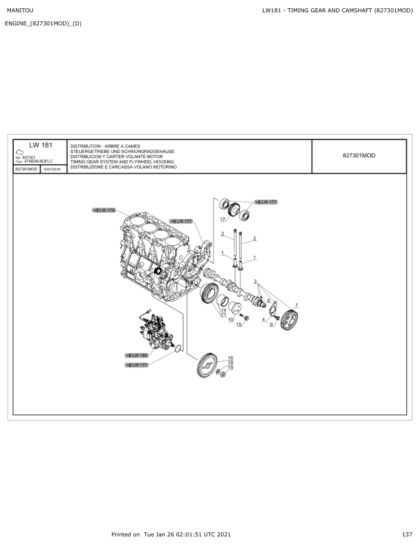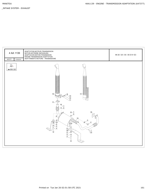 Manitou MI30 D Forklift Parts Catalog. This catalog provides comprehensive parts information for the Manitou MI30 D forklift model. It includes detailed diagrams and part numbers to assist in identifying and ordering the correct replacement parts for maintenance and repairs, ensuring optimal performance and minimizing downtime.