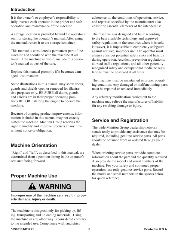 This Service Manual (50960181 Rev. B, 12/2021) covers all listed Manitou telescopic handler models: