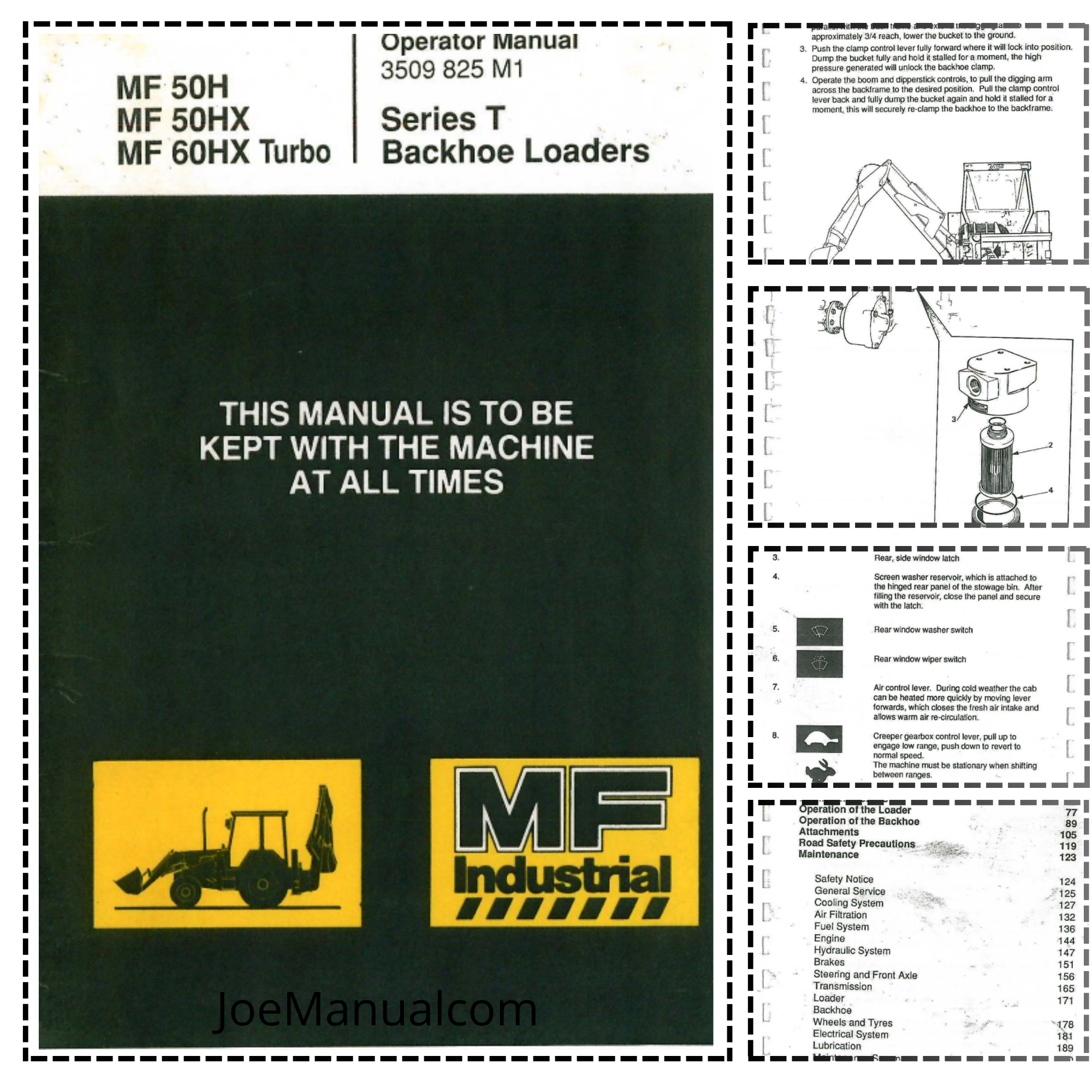The Massey Ferguson 50H MF 50HX MF 60HX Turbo Series T Backhoe Loaders Operator Manual is a comprehensive guide for users operating these Massey Ferguson backhoe loaders. It provides detailed instructions on the proper operation, routine maintenance, and safety procedures for these models. The manual includes information on the controls and instruments, operating techniques, and maintenance schedules, ensuring the equipment is used efficiently and safely. It also covers troubleshooting tips to help identify and resolve common issues, making it an essential resource for operators to maintain optimal performance and prolong the lifespan of their backhoe loaders.