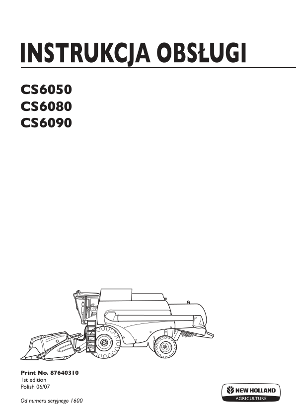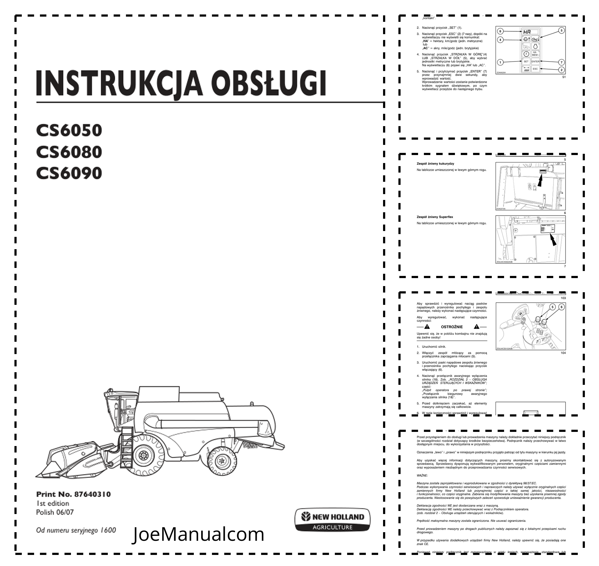 New Holland CS6050 CS6070 CS6080 CS6090 Combine Operators Manual PL. This manual provides comprehensive operating instructions and guidance for New Holland CS6050, CS6070, CS6080, and CS6090 combine harvesters. Specifically tailored for Polish-speaking operators, it covers all aspects of machine operation, maintenance, and safety procedures. New Holland CS6050 CS6070 CS6080 CS6090 Combine Operators Manual PL. This operator’s manual in Polish provides essential information for the safe and efficient operation and maintenance of New Holland CS6050, CS6070, CS6080, and CS6090 combine models. It details operating procedures, maintenance schedules, and safety guidelines.