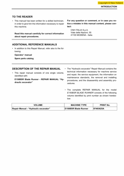 New Holland E150BSR Blade Runner Excavator Repair Manual