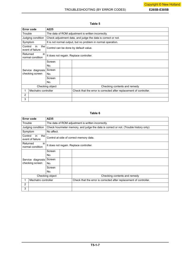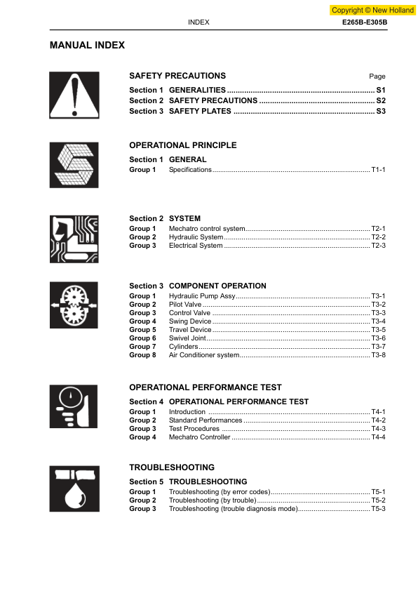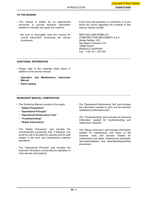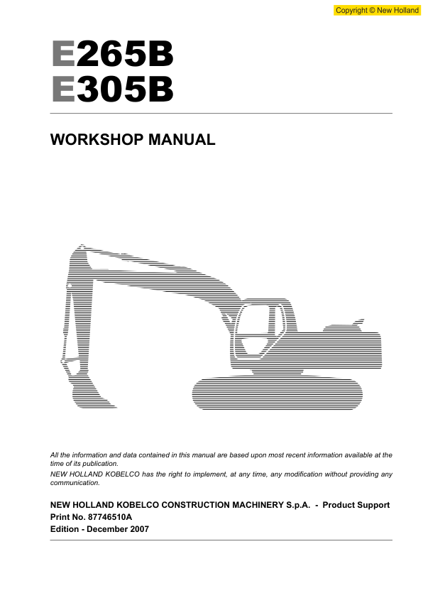 New Holland E265B E305B Excavator Workshop Manual