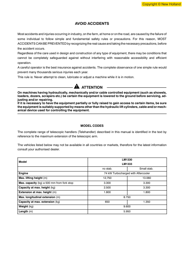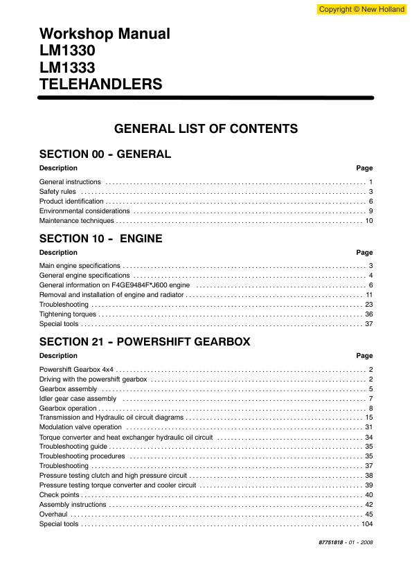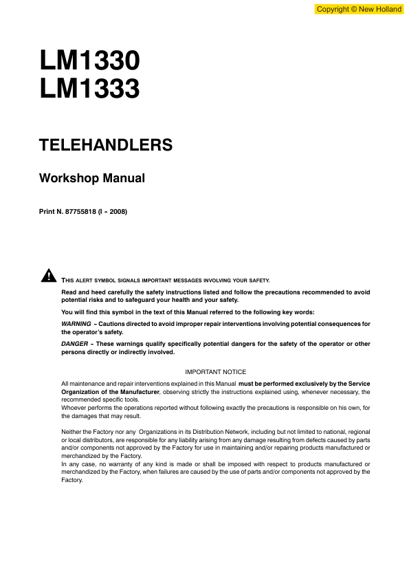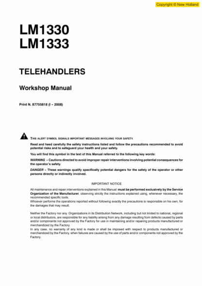 New Holland LM1330 LM1333 Telehandlers Workshop Manual