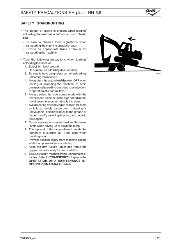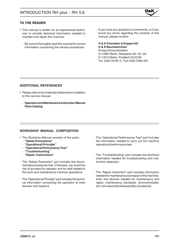 O&K RH plus 5.6 Excavators Workshop Manual is a comprehensive guide designed to assist mechanics and technicians in the maintenance and repair of O&K RH plus 5.6 Excavators. This manual provides detailed information on various aspects of the excavator, including engine specifications, hydraulic systems, electrical systems, and mechanical components. It offers step-by-step procedures for routine maintenance, troubleshooting, and complex repairs, ensuring that users can perform tasks efficiently and accurately. The manual is an essential resource for anyone working with O&K RH plus 5.6 Excavators, helping to extend the lifespan and performance of the machinery.