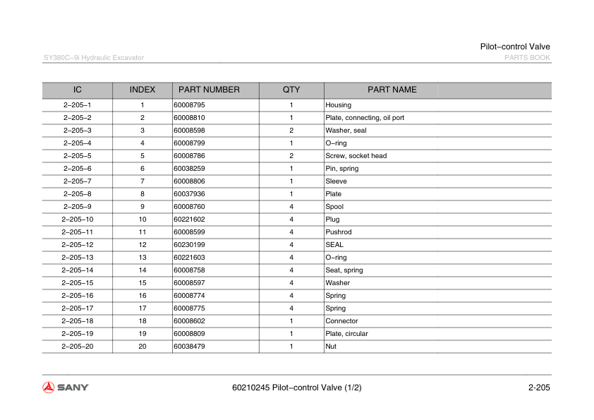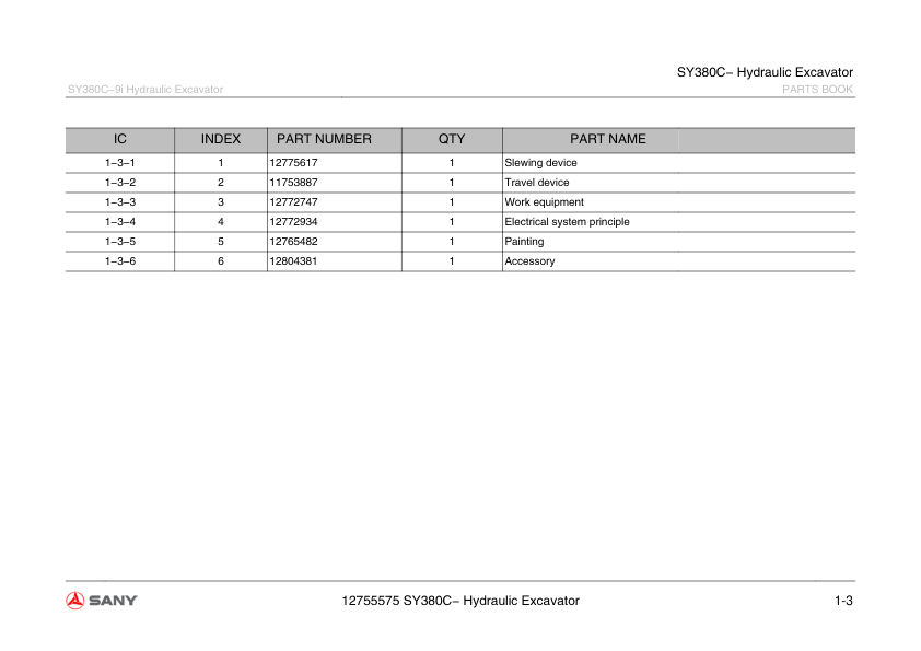 SANY SY380C Hydraulic Excavator Parts Catalog