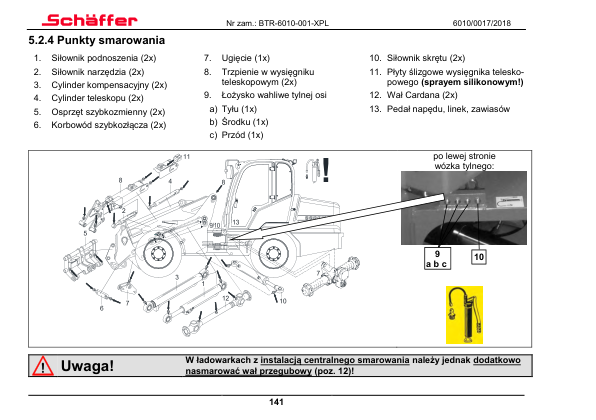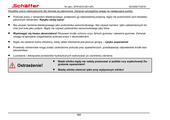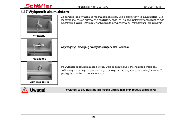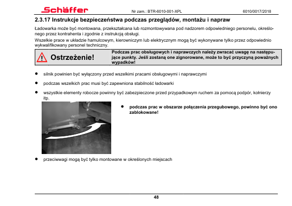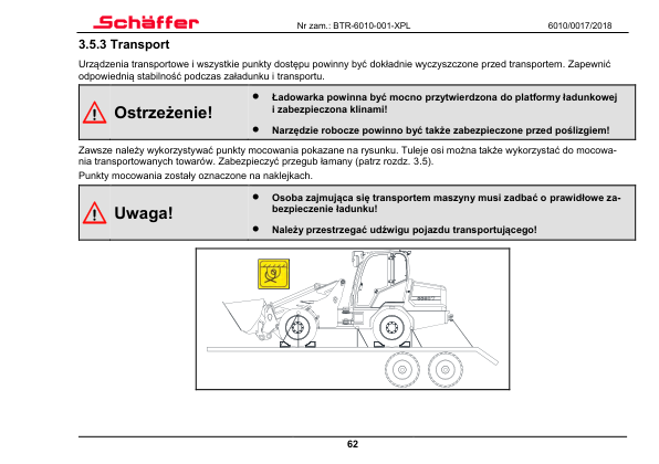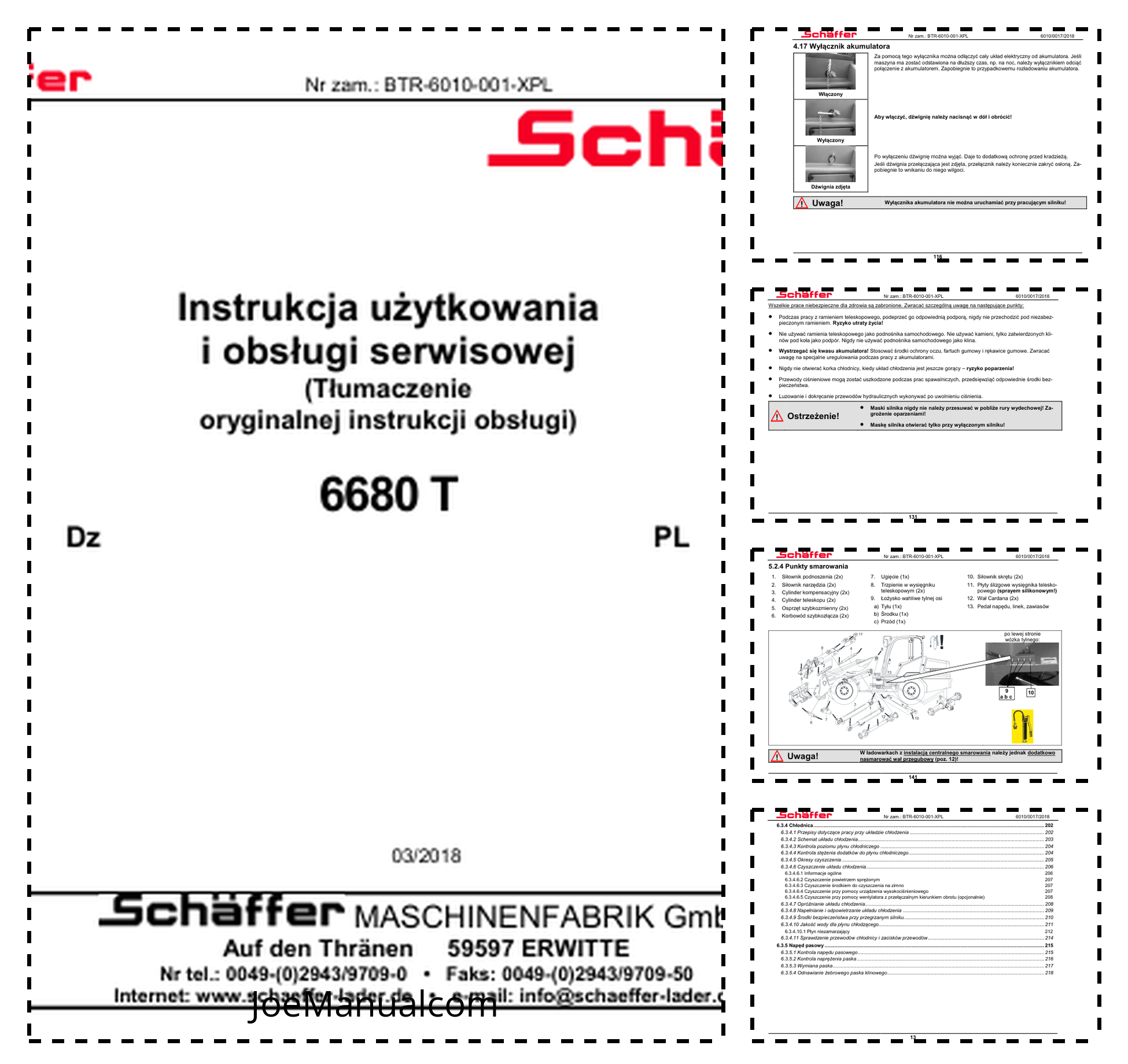 This manual provides essential information for the operation and maintenance of the Schaffer 6680T. It includes detailed instructions on starting, operating, and shutting down the machine safely. The manual covers routine maintenance tasks such as fluid checks, filter replacements, lubrication, and system inspections, along with recommended maintenance schedules to ensure optimal performance and longevity. Additionally, it offers troubleshooting tips, technical specifications, and guidelines for handling and storing the equipment properly. This document is crucial for operators and maintenance personnel to maintain the efficiency, safety, and reliability of the Schaffer 6680T.