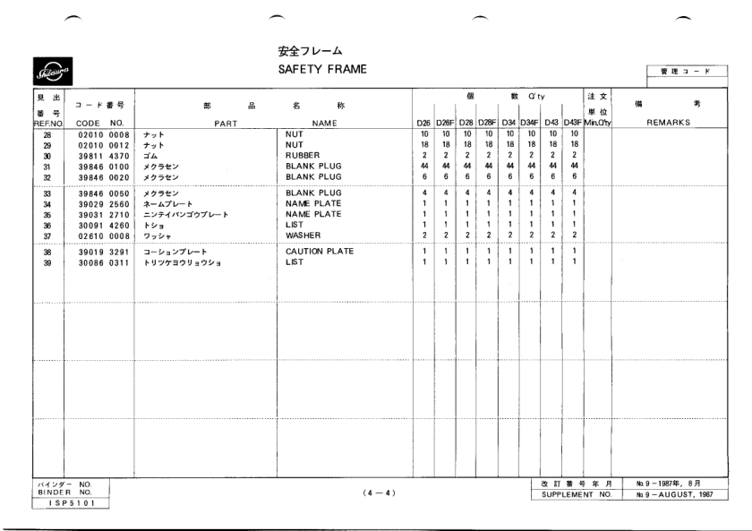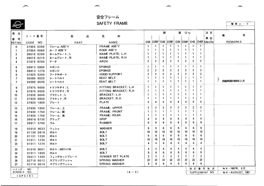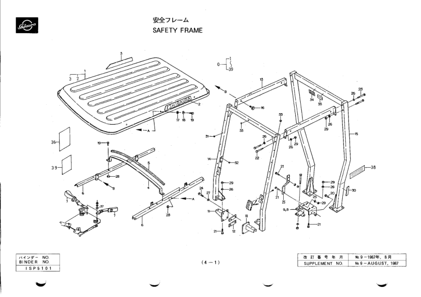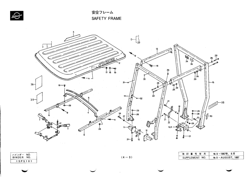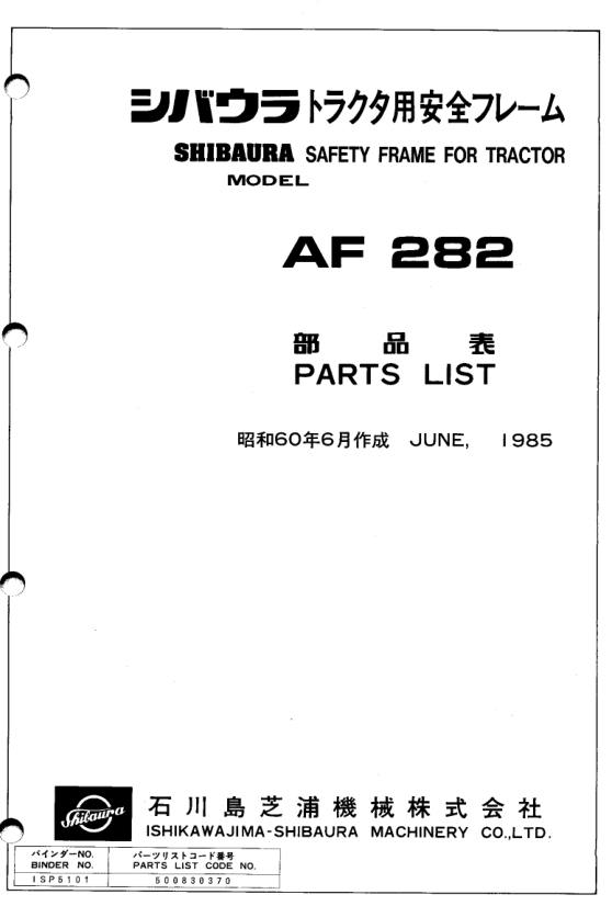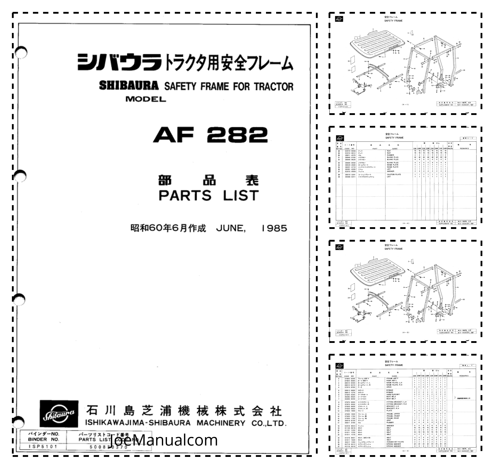 Shibaura Safety frame for tractor model AF282 Parts List Catalog This catalog provides a comprehensive parts list for the Shibaura Safety frame designed for the tractor model AF282. It is an essential resource for identifying and ordering the correct components needed for maintenance, repairs, or replacements. The catalog includes detailed diagrams, part numbers, and descriptions to ensure accuracy and efficiency in parts sourcing. Whether you are a professional mechanic, a tractor owner, or a parts supplier, this catalog is a valuable tool for ensuring you have the right parts for the job. It simplifies the process of sourcing parts and helps maintain the safety and functionality of your Shibaura tractor.