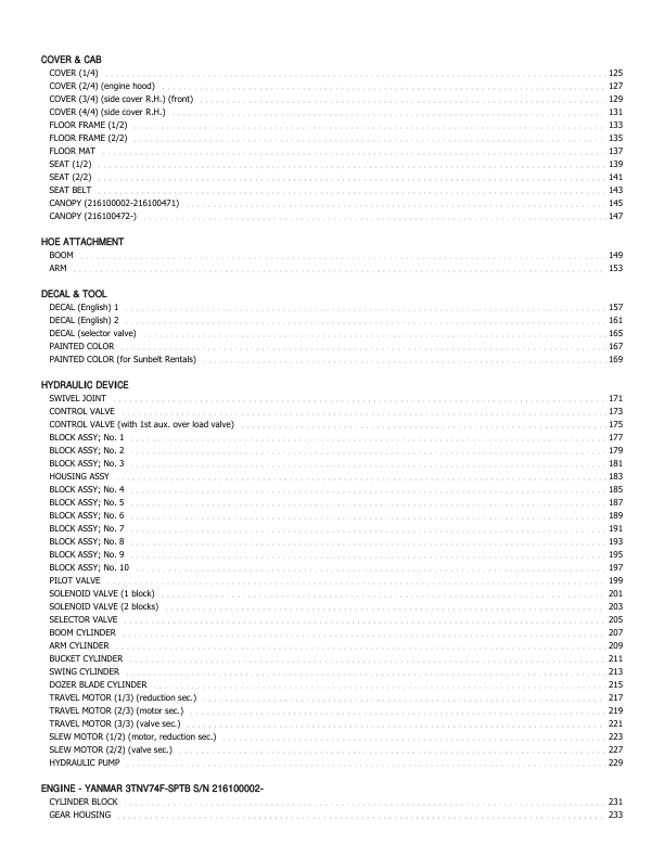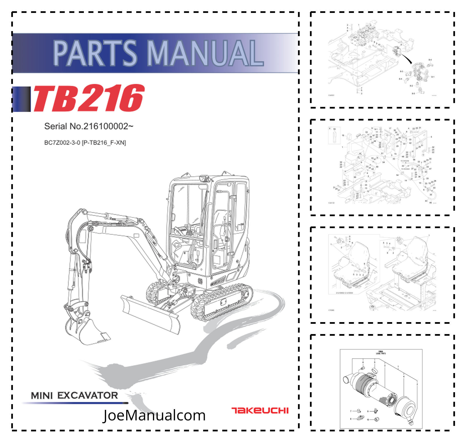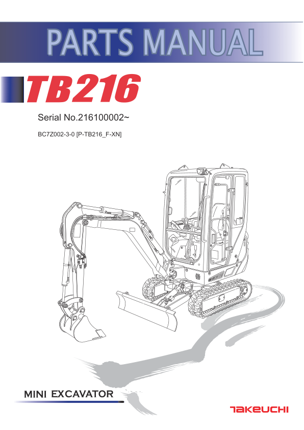 Takeuchi TB216 Compact Excavator Parts Manual SN 216100002 is a detailed and comprehensive manual designed specifically for the Takeuchi TB216 Compact Excavator with serial numbers starting from 216100002. This manual serves as an essential resource for operators, mechanics, and technicians, providing a thorough breakdown of the excavator’s components, assemblies, and systems. It includes detailed diagrams, parts lists, and specifications, ensuring accurate identification and sourcing of replacement parts. Whether for routine maintenance, repairs, or complete overhauls, this manual is an invaluable tool for maintaining the performance and longevity of the Takeuchi TB216 Compact Excavator.