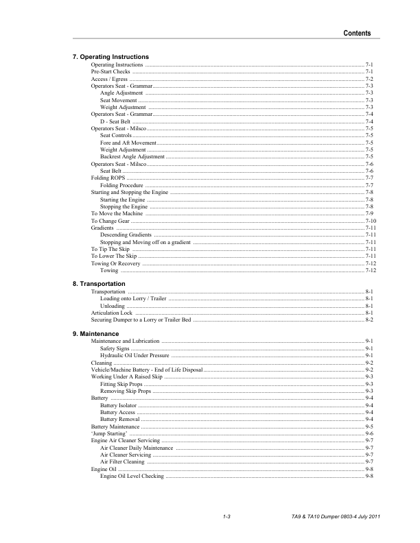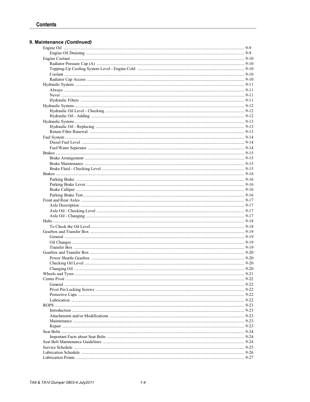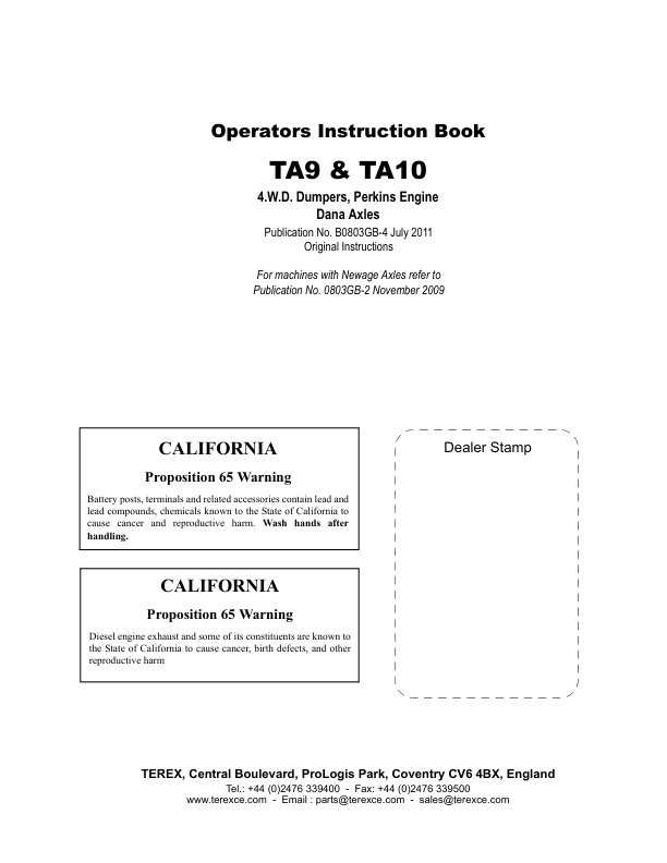 Terex TA9 TA10 4WD Dumpers with Perkins Engine Operators Manual