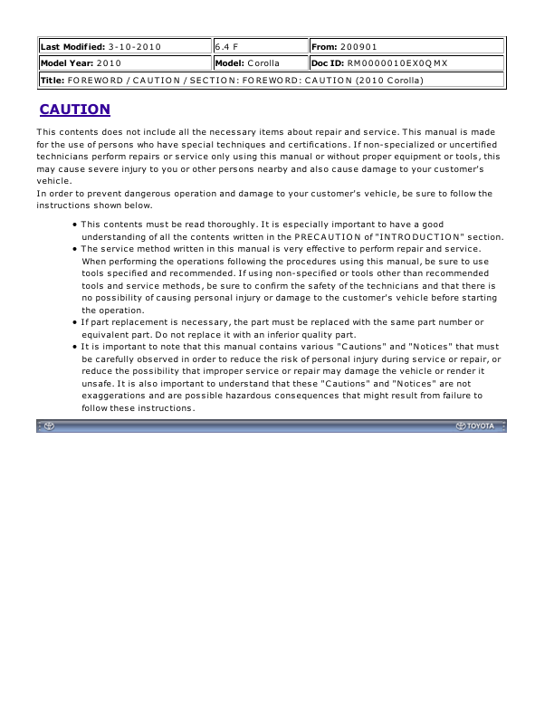 Toyota Corolla 2009-2012 Workshop Repair Manual