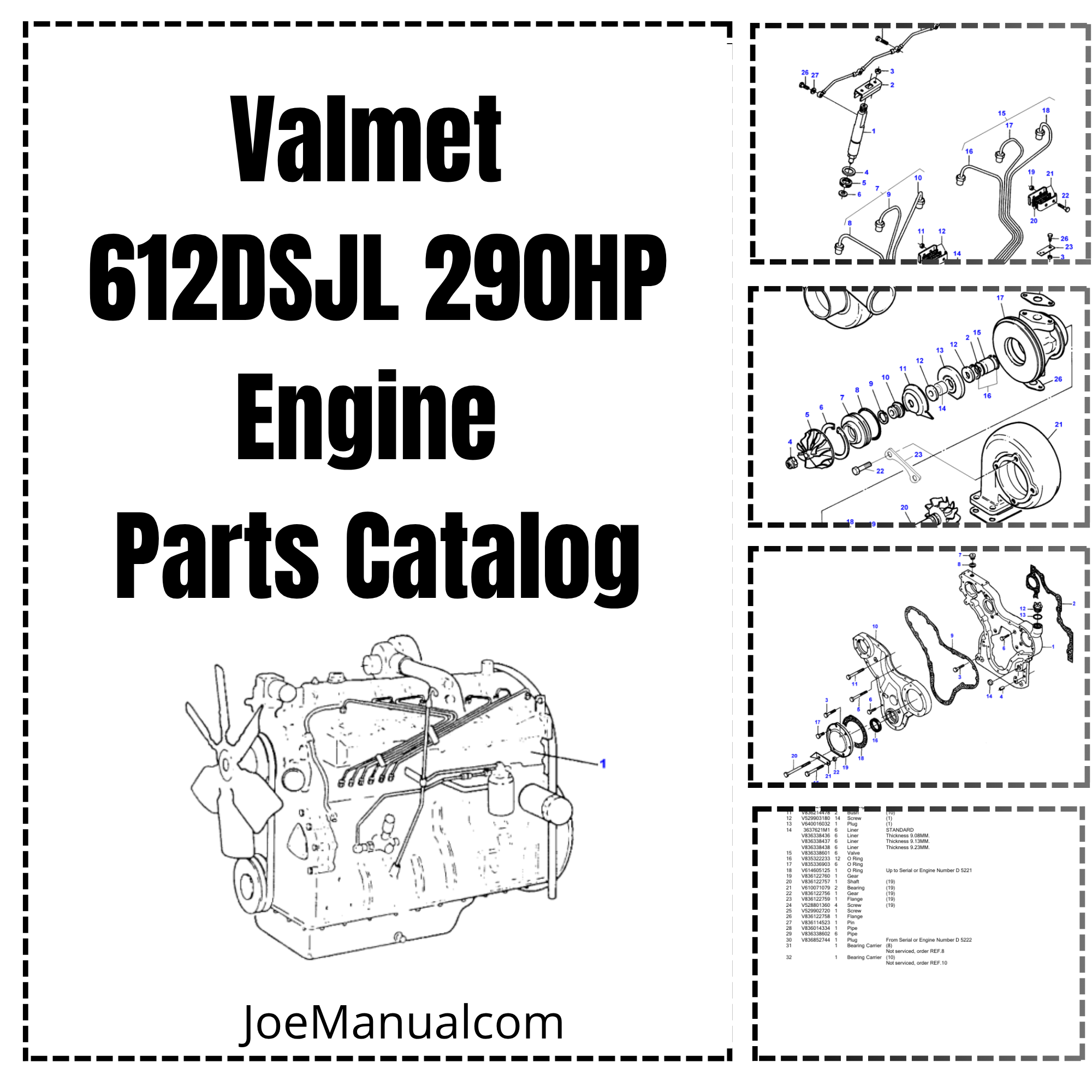 Valmet 612 DSJL 290 HP Engine Parts Catalog. This comprehensive parts catalog provides detailed illustrations and part numbers for the Valmet 612 DSJL 290 HP engine, assisting in accurate part identification and ordering for maintenance and repairs.