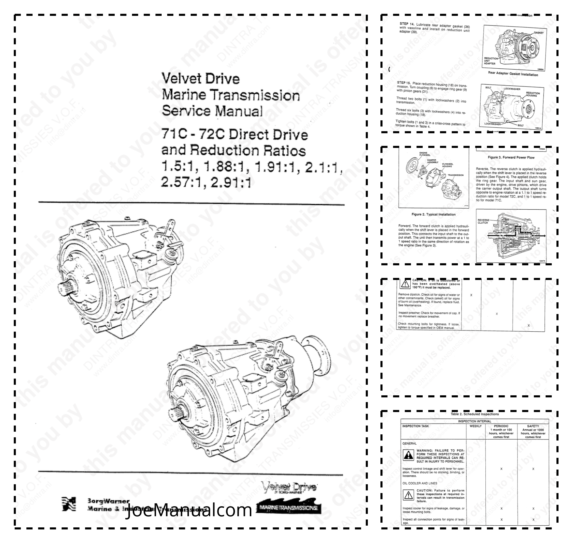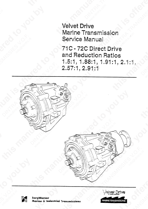 Velvet Drive 71 C 72 C Marine Transmission Service Manual is a comprehensive guide designed for the maintenance and repair of Velvet Drive marine transmissions. This manual provides detailed instructions, diagrams, and specifications to help marine technicians and boat owners service the 71C and 72C models with confidence. It covers essential topics such as disassembly, inspection, and reassembly procedures, ensuring optimal performance and longevity of the transmission. Whether you are a professional or a DIY enthusiast, this service manual is an invaluable resource for keeping your marine transmission in top condition.