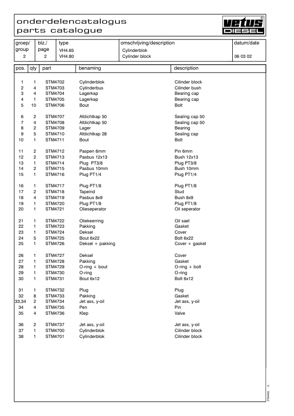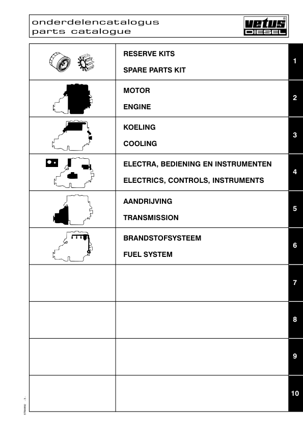The Vetus VH4 65 VH4 80 Diesel Engine Parts Catalog is a comprehensive guide designed to assist in the identification and sourcing of genuine replacement parts for the Vetus VH4 65 and VH4 80 marine diesel engines. This catalog provides detailed illustrations and specifications for all engine components, ensuring precise part identification and compatibility. Whether you are a professional marine technician or a boat owner performing maintenance, this catalog is an essential tool for ensuring the longevity and optimal performance of your Vetus diesel engine. The catalog includes part numbers, diagrams, and descriptive details, making it easier to find the exact components needed for repairs or routine servicing. With its user-friendly layout, the Vetus VH4 65 VH4 80 Diesel Engine Parts Catalog is an invaluable resource for anyone working with these reliable marine engines.