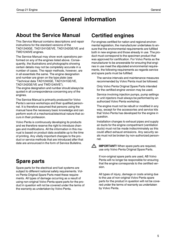 Volvo Penta TAD1240GE TAD1241GEVE TAD1242GEVE TWD1240VE Engine Group 21 Workshop Manual
