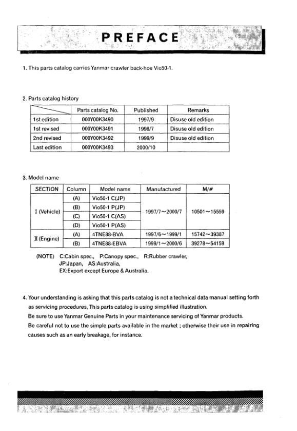 This comprehensive parts manual contains detailed wiring diagrams for the Yanmar VIO50-1 Excavator. It provides essential information for identifying and ordering replacement parts, as well as understanding the electrical system. This manual is an invaluable resource for maintenance, troubleshooting, and repair procedures, ensuring optimal performance of your equipment.