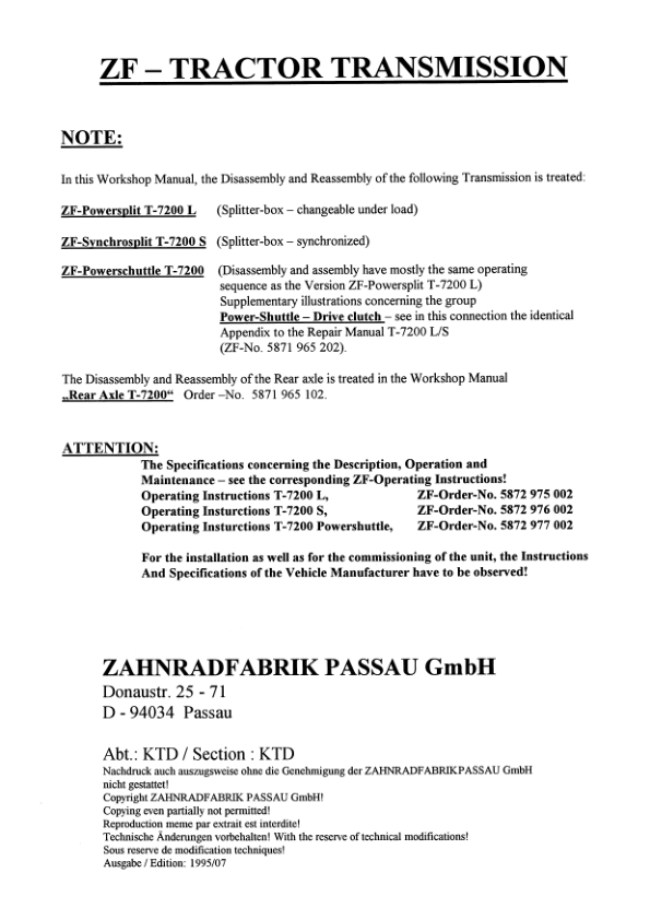 ZF T-7200 L Powersplit and T-7200 S Synchrosplit Transmission Workshop Manual